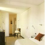 El rodapié del instalo blanco, los armarios empotrados con puertas abatibles de madera lacada del mismo color que la pared con interior en textil lavable.