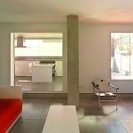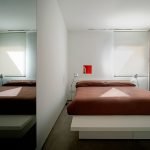 El resto de la vivienda se resuelve también con madera, pero esta vez en DM lacado blanco. El mobiliario se realiza también en dm lacado en blanco, cama, sillón, mesa de salón y despacho banquetas de cocina que dan orden a la vivienda. El color se deja para el marco envolvente de la ventana que asoma a la terraza. Dos estilos el industrial y el blanco que unidos compaginan perfectamente. El resultado de esta reforma integral en Madrid es que hemos conseguido modernizar sustituyendo algunos elementos y renovándolos.